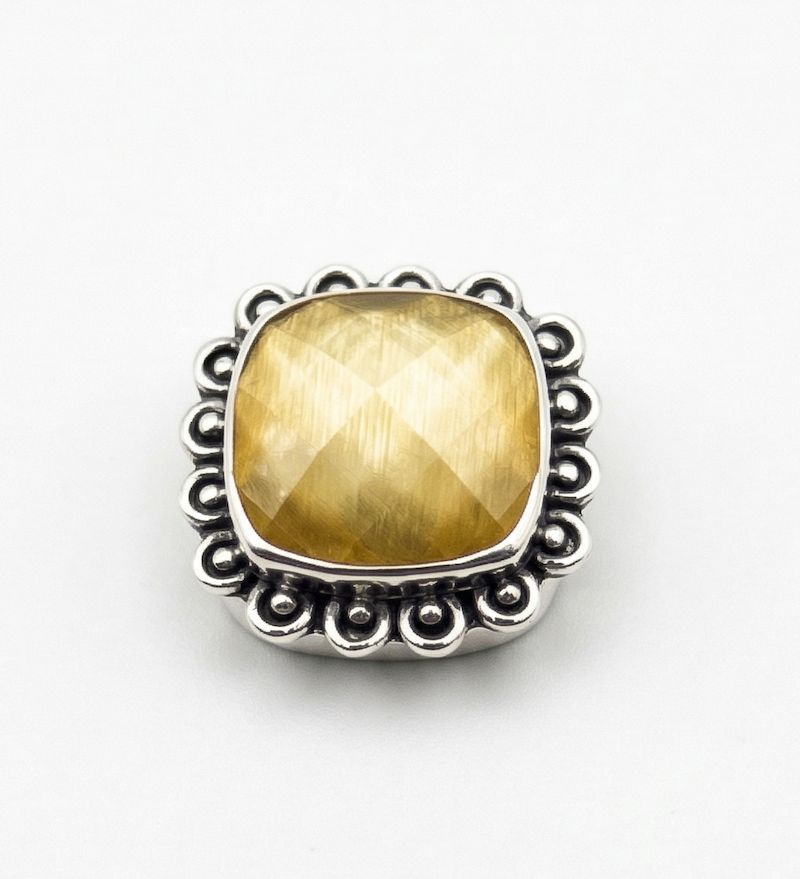 A faceted tiger's eye in an oval sterling silver setting with bold circle detailing. Warm golden-brown with natural banding that shifts in the light. Never produced. Approximately 3/4".
