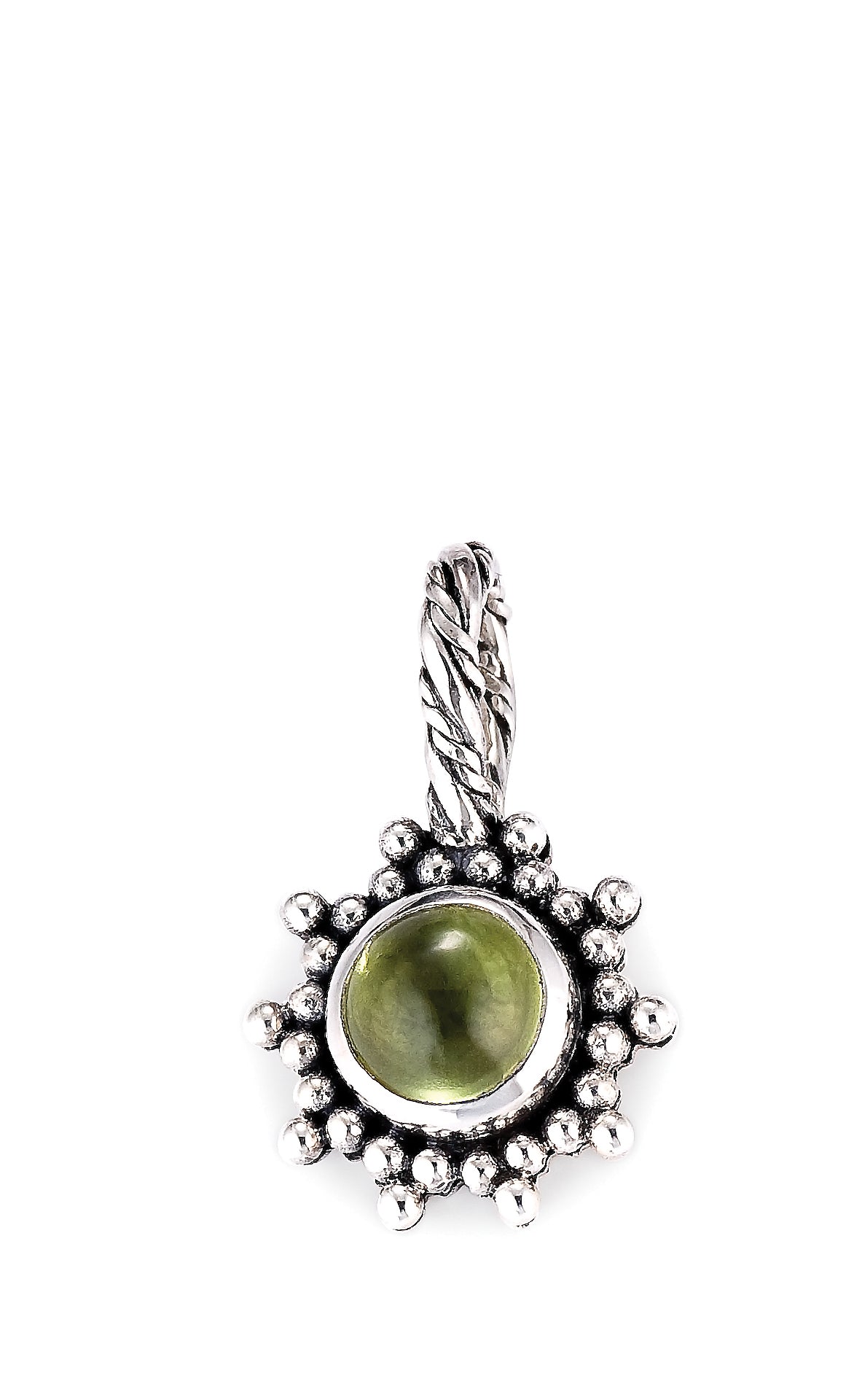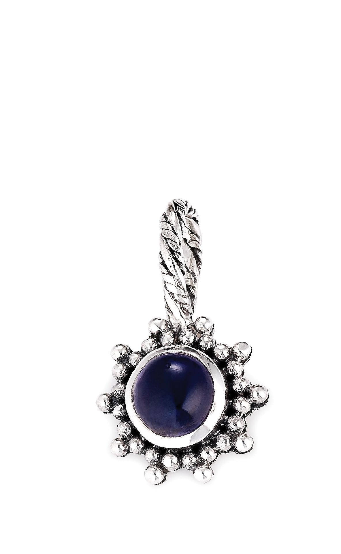 A sterling silver peacock with chrome diopside and iolite stones trailing along its tail feathers, on an 18" handwoven foxtail chain. Green and blue-violet together — it's a lot of...